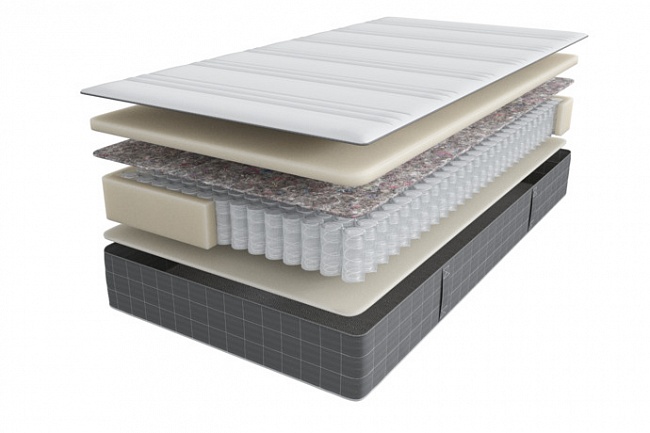 Анатомическая пена в составе матраса — комфортный барьер между пружинным блоком и спальной поверхностью, позволяет принять максимально удобное положение во время сна. Еще один дополнительный слой — хлопковый войлок — защищает и амортизирует пружинный блок, а также выполняет роль терморегулятора.